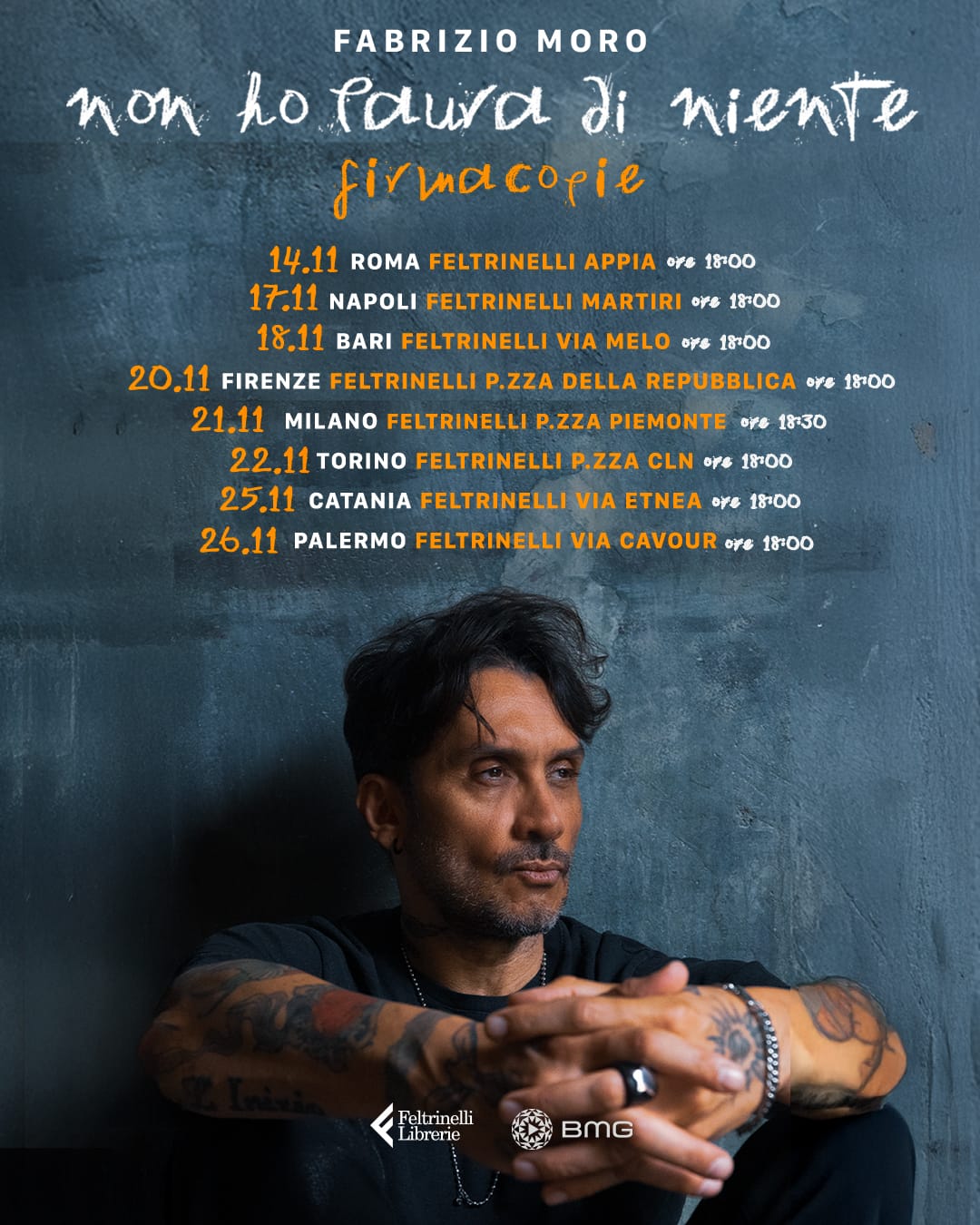 Dopo l’evento tenutosi lo scorso 25 ottobre a Roma riservato a chi ha acquistato il Bundle, Fabrizio Moro presenterà il nuovo album al pubblico con un instore tour al via il 14 novembre, giorno di uscita dell’album: