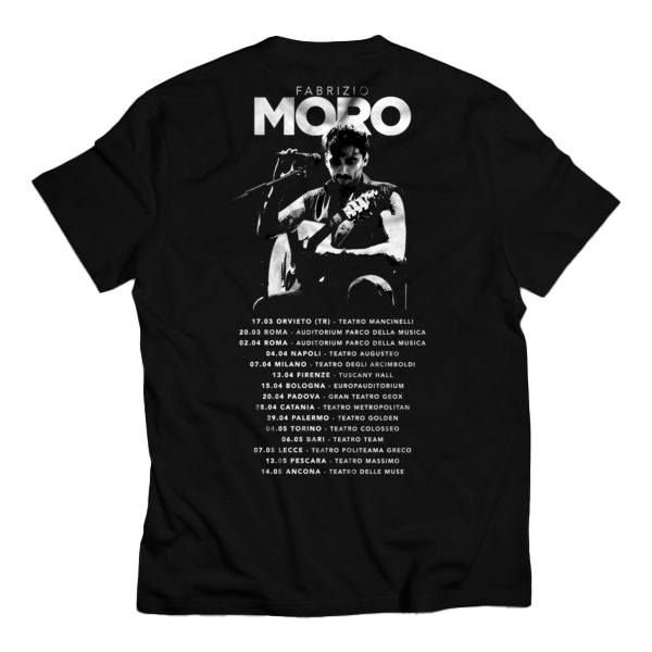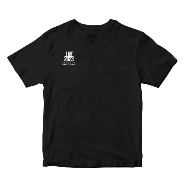 T-Shirt Fabrizio Moro nera 100% cotone con stampa bianca "LIVE 2023 RACCONTI UNPLUGGED".